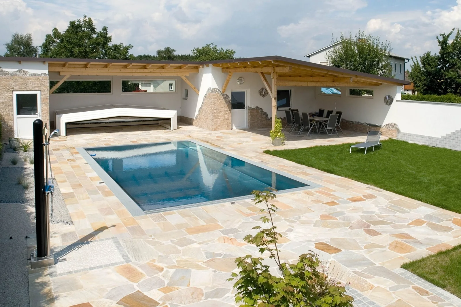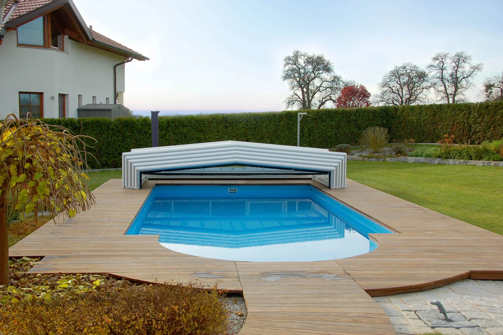 Cet abri de piscine télescopique bas séduit par la sobriété de ses lignes modernes et sa manipulation intuitive, tout en s’intégrant parfaitement à votre environnement extérieur.