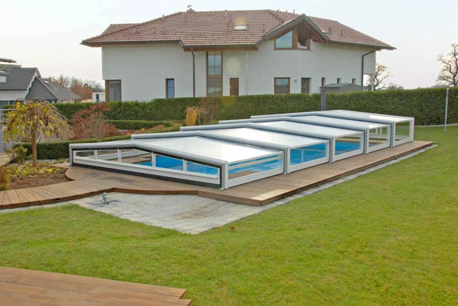 Abri de piscine télescopique bas à 3 angles : design minimaliste et simplicité d’utilisation