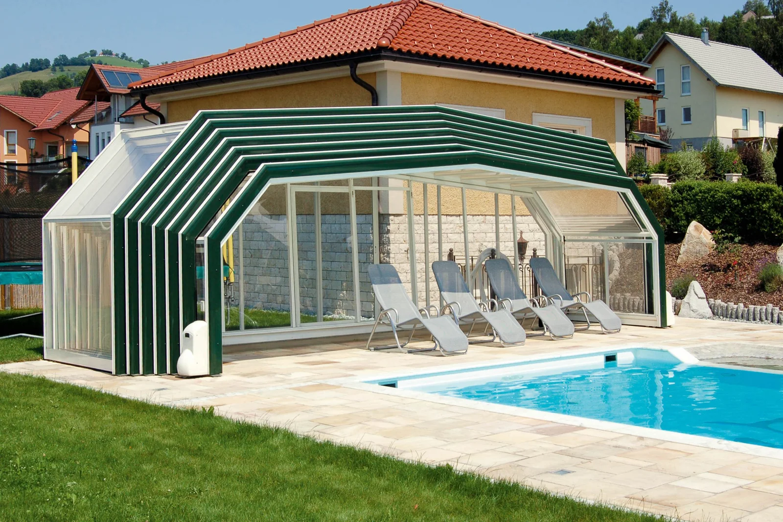 Si l’abri est attenant, il permet un accès direct et fluide à la piscine, sans obstacle gênant.