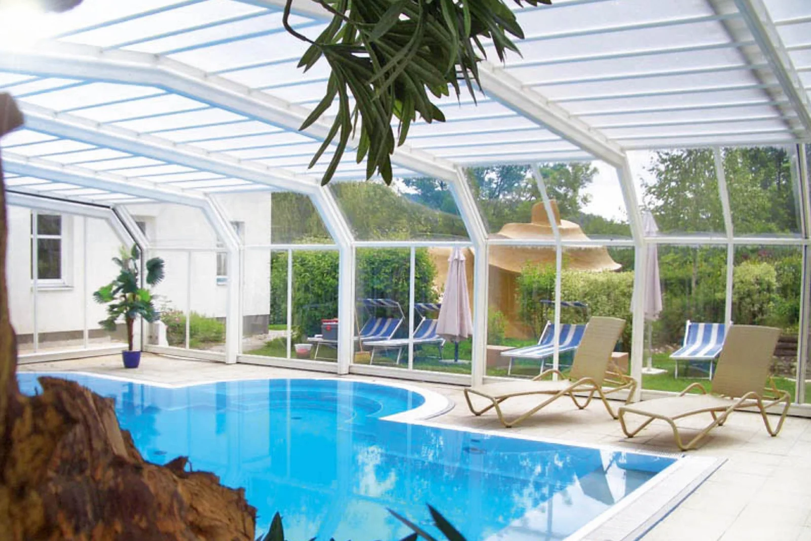 •Toiture en polycarbonate alvéolaire translucide, offrant isolation et luminosité.